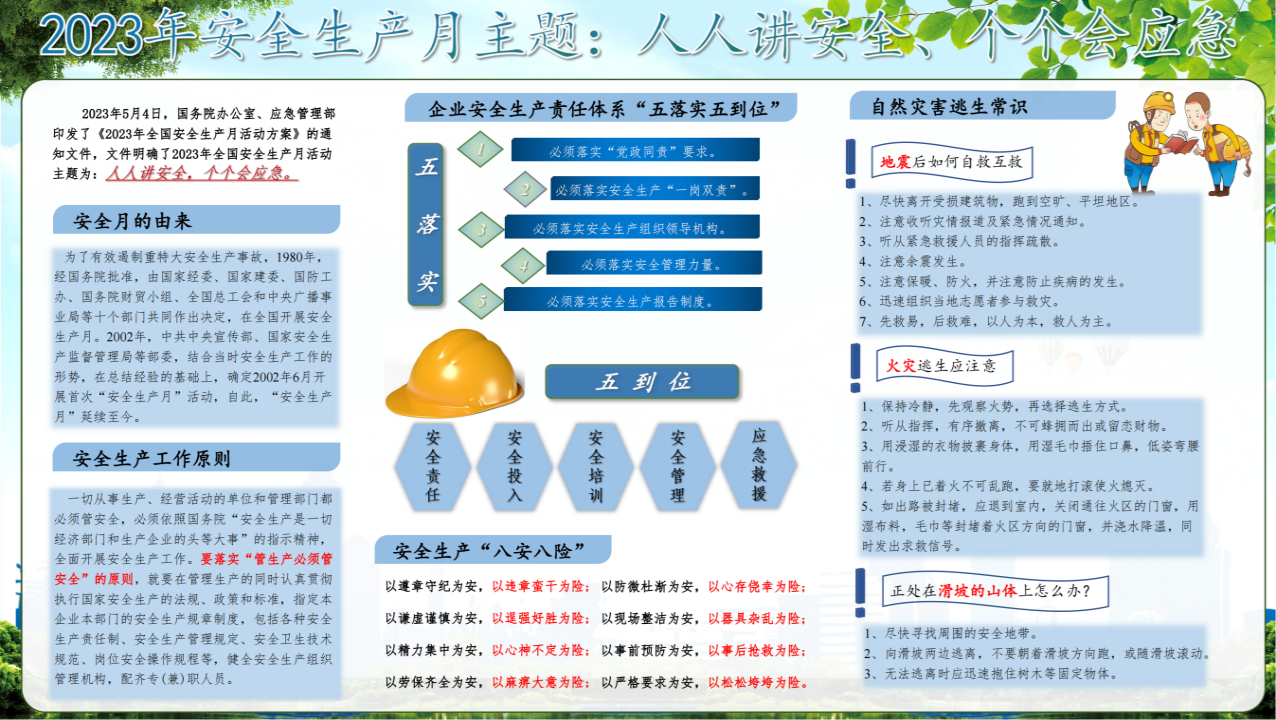 今年6月是全國第22個“安全生產(chǎn)月”,為深入貫徹落實習近平總書記關于安全生產(chǎn)重要論述精神,持續(xù)深化“意識+責任+標準化”安全管理體系,大力傳播安全理念、弘揚安全文化,扎實開展好“安全生產(chǎn)月”活動,引導廣大干部職工進一步增強安全意識、責任意識、紅線意識、標準意識,不斷夯實安全基礎,公司從多角度、多形式開展安全教育活動,全面提升員工的安全防范意識。