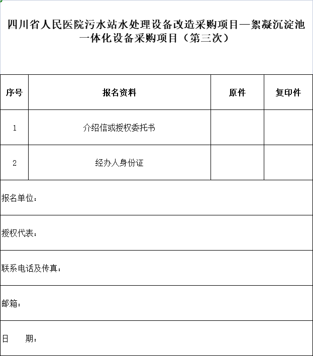 項(xiàng)目名稱:四川省人民醫(yī)院污水站水處理設(shè)備改造采購(gòu)項(xiàng)目——絮凝沉淀池一體化設(shè)備采購(gòu)項(xiàng)目(第三次)