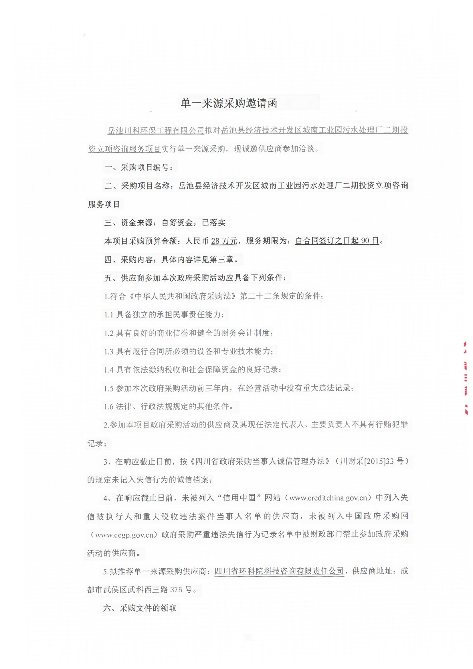下一篇:岳池經(jīng)濟(jì)技術(shù)開發(fā)區(qū)污水處理廠二期項(xiàng)目(四川省岷江、沱江流域水污染物排放標(biāo)準(zhǔn))技術(shù)方案服務(wù)—單一來源采購公告