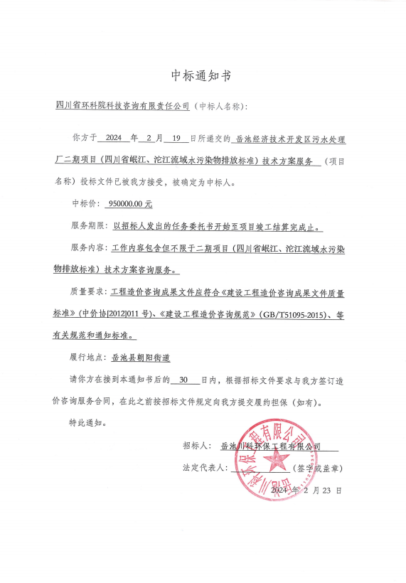 岳池經(jīng)濟技術(shù)開發(fā)區(qū)污水處理廠二期項目(四川省岷江、沱江流域水污染物排放標準)技術(shù)方案服務(wù)—中標通知書