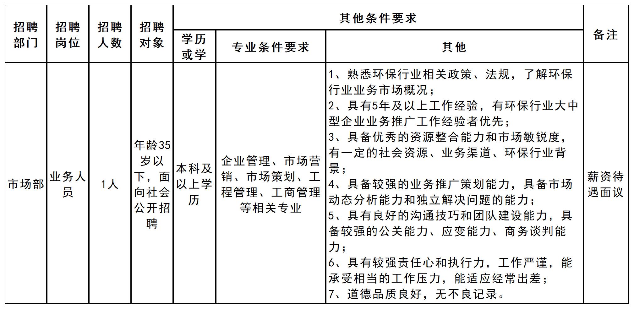 | 市場部 | 業(yè)務(wù) 員 | 若干 | 年齡45歲以下,面向社會(huì)公開招聘 | 本科及以上學(xué)歷 | 專業(yè)不限 | 1、熟悉環(huán)保行業(yè)相關(guān)政策、法規(guī),了解環(huán)保行業(yè)業(yè)務(wù)市場概況; 2、具有5年及以上工作經(jīng)驗(yàn),有大中型企業(yè)市場營銷經(jīng)驗(yàn)者優(yōu)先; 3、具備優(yōu)秀的資源整合能力和市場敏銳度,有一定的社會(huì)資源、業(yè)務(wù)渠道、環(huán)保行業(yè)背景; 4、具備較強(qiáng)的業(yè)務(wù)推廣策劃能力,具備市場動(dòng)態(tài)分析能力和獨(dú)立解決問題的能力; 5、具有良好的溝通技巧和團(tuán)隊(duì)建設(shè)能力,具備較強(qiáng)的公關(guān)能力、應(yīng)變能力、商務(wù)談判能力; 6、具有較強(qiáng)責(zé)任心和執(zhí)行力,工作嚴(yán)謹(jǐn),能承受相當(dāng)?shù)墓ぷ鲏毫Γ苓m應(yīng)經(jīng)常出差; 7、道德品質(zhì)良好,無不良記錄。 |