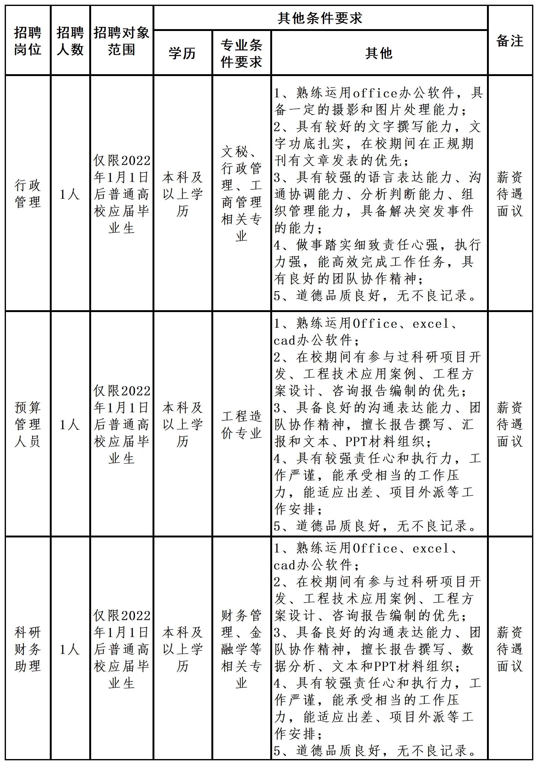 | 注冊二級(jí)建造師 | 1 | 面向社會(huì)公開招聘 | 普通高校本科及以上學(xué)歷 | 市政專業(yè) | 1、熟練使用Office辦公軟件,CAD繪圖軟件的優(yōu)先; 2、具有獨(dú)立開展本專業(yè)工作的經(jīng)驗(yàn),具有一定的技術(shù)方案撰寫能力; 3、具有市政公用工程施工總承包貳級(jí)及以上資質(zhì)單位工作經(jīng)驗(yàn),主持或參與市政公用工程項(xiàng)目2項(xiàng)及以上工作業(yè)績; 4、有評(píng)獎(jiǎng)評(píng)優(yōu)經(jīng)歷或參與過科技廳、環(huán)保廳等科研項(xiàng)目經(jīng)驗(yàn)的優(yōu)先; 5、思想政治素質(zhì)和職業(yè)操守好,遵紀(jì)守法、誠實(shí)守信,無不良記錄; 6、中共黨員優(yōu)先。 | 待遇面議 |